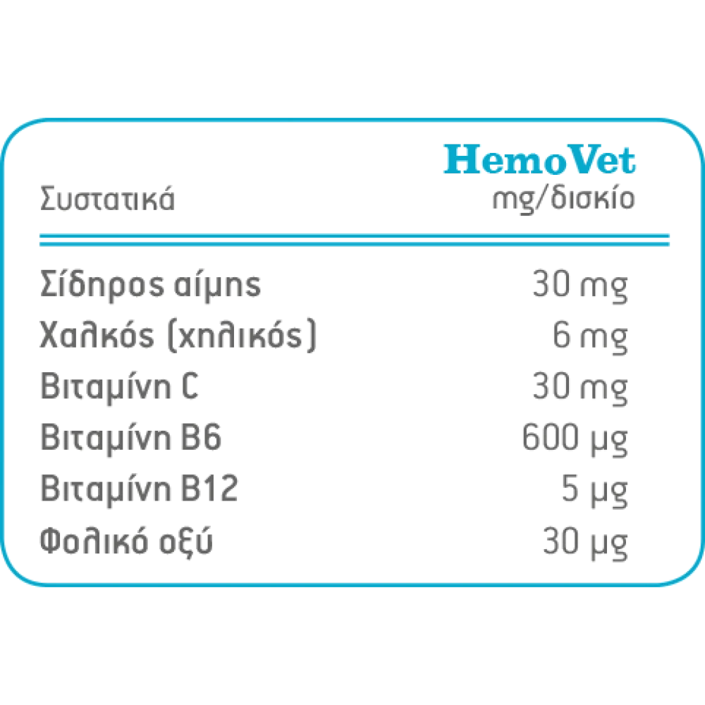 Συστατικά ανά δισκίο: Σίδηρος αίμης 30 mg ,Χαλκός (χηλικός) 6 mg, Βιταμίνη C 30 mg ,Βιταμίνη B6 600 mg ,Βιταμίνη B12 5 mg, Φολικό οξύ 30 mg