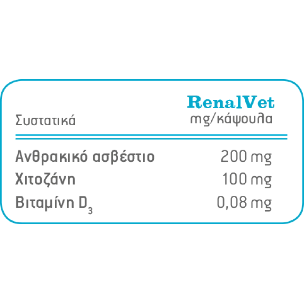 Χρήσεις :Το RenalVet προτείνεται για την υποστήριξη της νεφρικής λειτουργίας και την αντιμετώπιση των συμπτωμάτων σε σκύλους και γάτες με χρόνια νεφρική ανεπάρκεια.