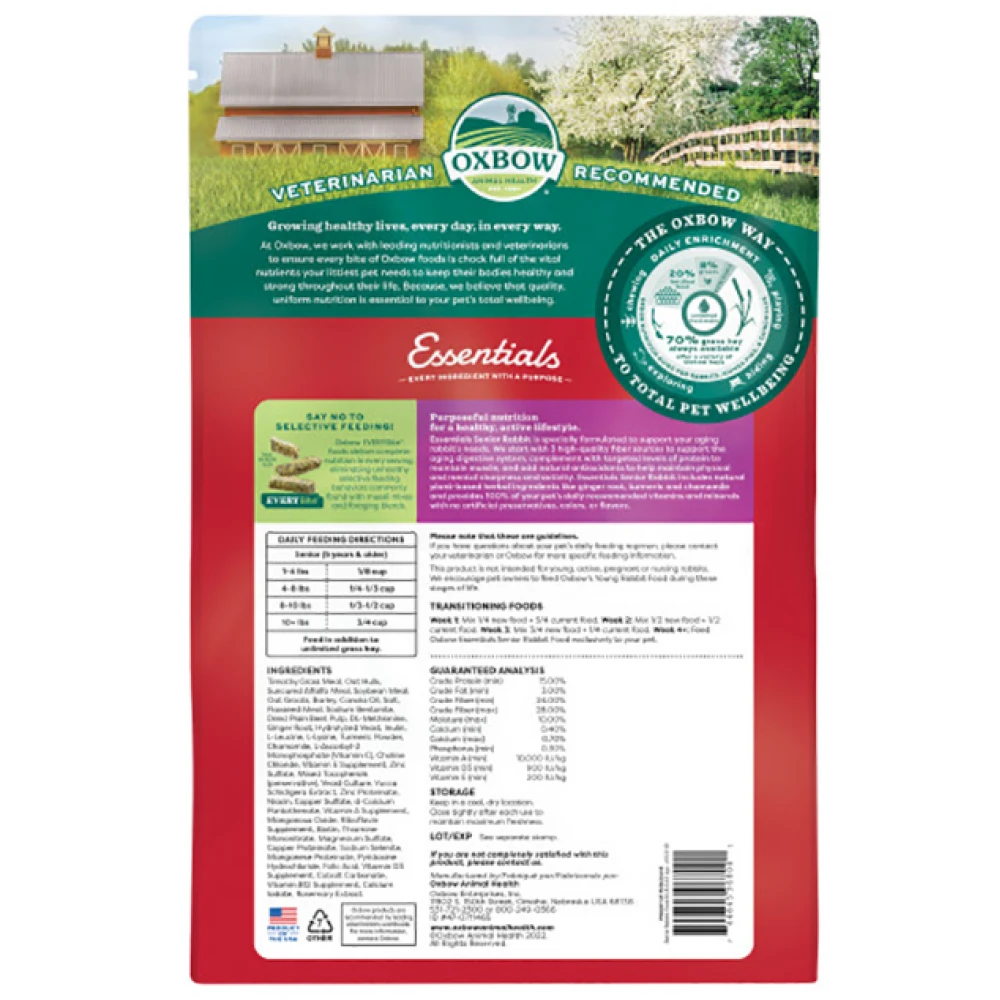 ΤΡΟΦΗ ΚΟΥΝΕΛΙΟΥ OXBOW ESSENTIALS SENIOR RABBIT 1,81Kg. Όλα τα κουνέλια χρειάζονται υψηλή περιεκτικότητα σε ίνες για να κρατήσει το πεπτικό τους σύστημα να λειτουργεί σωστά , καθώς και οι βασικές βιταμίνες και τα ανόργανα συστατικά να μεγιστοποιήσουν την κατασταση της υγεία τους . Η OXBOW Essentials συνδυάζει τις απαραιτητες ίνες με σταθεροποιημένα θρεπτικά συστατικά για να εξασφαλιστεί μια καλά ισορροπημένη διατροφή.